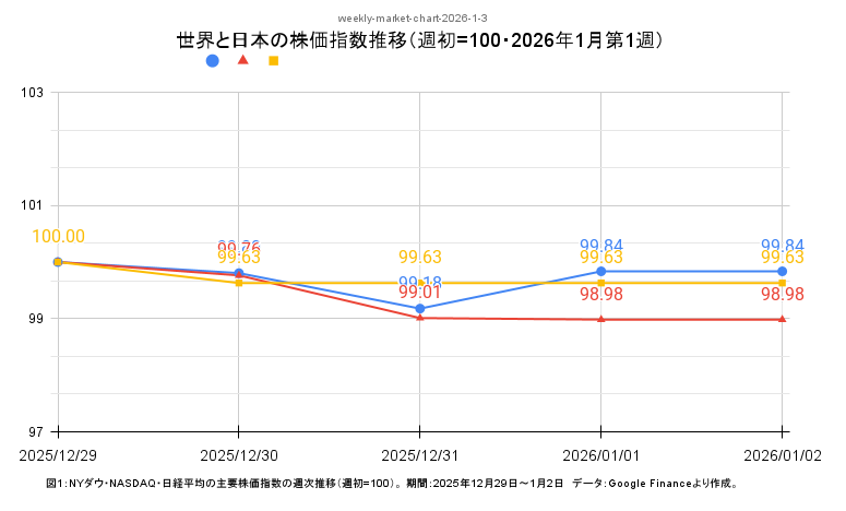 NYダウ・ナスダック・日経平均の値動きを比較した折れ線グラフ。