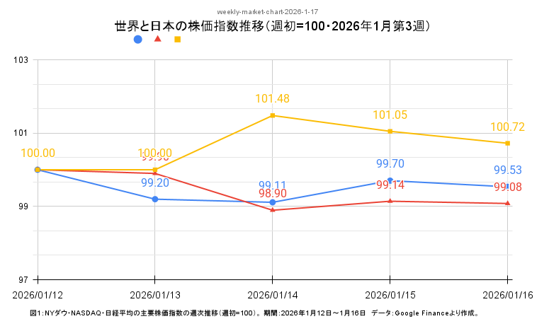 NYダウ・ナスダック・日経平均の1週間の値動きを示した折れ線グラフです。