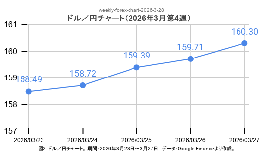 ドル円の1週間の値動きを示したグラフです。円安基調は継続し、160円台に到達しました。