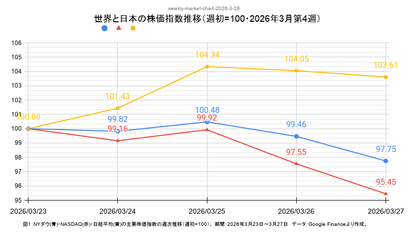 NYダウ・ナスダック・日経平均の動きを比較したグラフです。