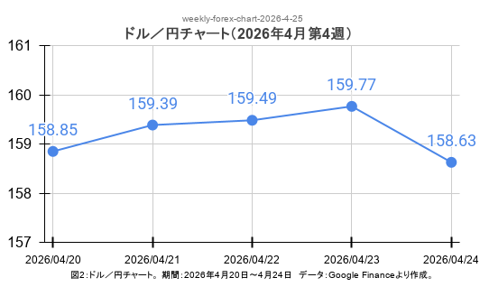 ドル円の1週間の推移です。159円台での推移が続き、円安トレンドは維持されつつも方向感はやや鈍化しています。